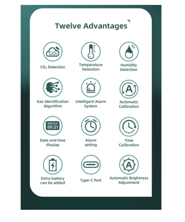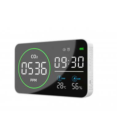 Der 4-in-1-CO₂-Luftqualitätsmonitor ist ein funktionales Gerät, das gleichzeitig vier wichtige Parameter misst: den Kohlendioxidgehalt, die Temperatur, die Luftfeuchtigkeit und die Zeit. Dank der kontinuierlichen Analyse der CO₂-Konzentration trägt er dazu bei, gesunde und angenehme Raumbedingungen aufrechtzuerhalten. Der Messbereich umfasst 400–5000 ppm für CO₂, 0–50 °C für die Temperatur und 0–99 % r. F. für die Luftfeuchtigkeit. Es eignet sich sowohl für den Einsatz zu Hause, im Büro, in der Schule, im Lager als auch in Anbau- oder Produktionsräumen.