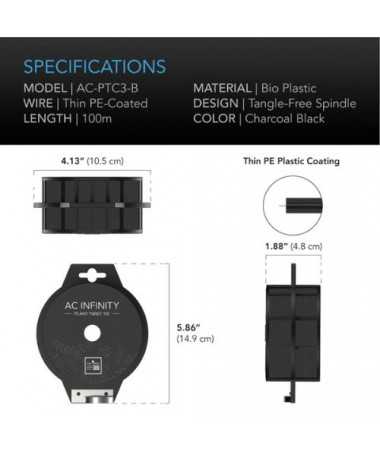 AC Infinity Black Twist Ties mit integriertem Schneidegerät sind strapazierfähige, beschichtete Gartendrahtbinder zum Aufbinden von Pflanzen. Das Produkt hat eine schwarze (graphitfarbene) Farbe und wird in Rollen mit einer Gesamtlänge von 100 m verkauft, wodurch sich die Drahtmenge leicht an die Anforderungen der Kultur anpassen lässt.