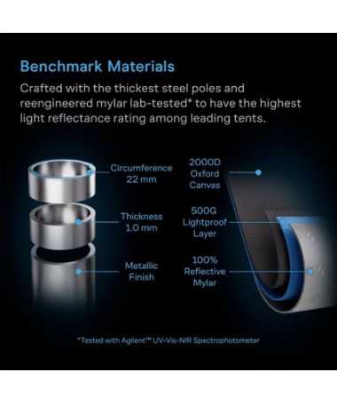 Namiot został wykonany z wyjątkowo odpornego płótna Oxford 2000D, które zapewnia trwałość oraz zwiększoną ochronę przed uszkodzeniami i przenikaniem światła. Zastosowano tu stalowy stelaż 22 mm, który jest wyraźnie mocniejszy niż standardowe rurki 18 mm spotykane w wielu klasycznych growboxach. Dzięki temu oraz dzięki dodatkowym belkom do podwieszania, konstrukcja może utrzymać ciężki osprzęt – nawet do 113 kg (250 lbs) podczas długotrwałego użytkowania.