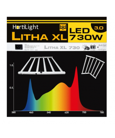 Lampa LED HortiLight Litha XL 730 W Full Spectrum o wydajności 3.0 µmol/J to nowoczesne rozwiązanie do oświetlania upraw indoor, zapewniające skuteczne pokrycie powierzchni do 150 × 150 cm. Oferuje pełne spektrum światła, wspierające zarówno wzrost, jak i fazę kwitnienia roślin.