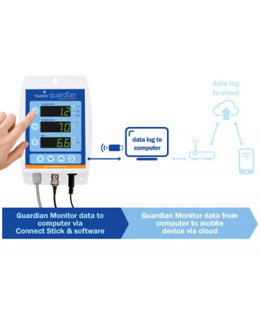 Navíc máte možnost vzdáleného přístupu k datům přes cloud na libovolném mobilním zařízení nebo počítači. Tak můžete monitorovat extrémní výkyvy a parametry. Vše, co potřebujete, je Bluelab Connect Stick (k dostání samostatně), který umožňuje bezdrátový příjem dat z jednoho nebo více monitorů Guardian Monitor Connect.