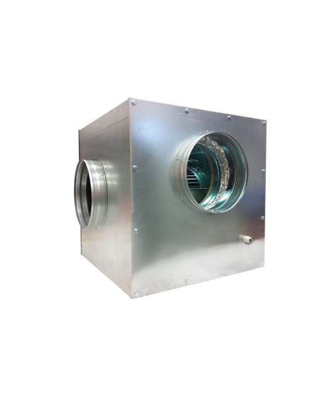 4250m3/h RADIALVENTILATOR , SOFTBOX SILENCED STEEL, 65x65xh65cm, 1400rpm, 1450W, fi400+2x250mm