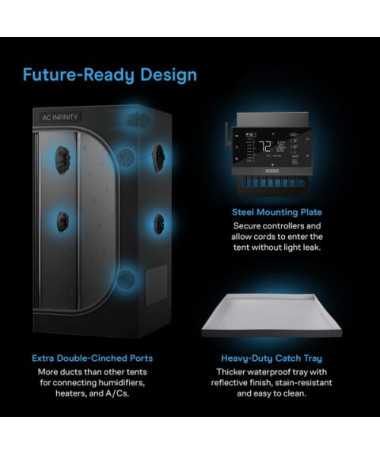 Ein weiteres Highlight der Konstruktion ist die innovative Montageplatte für den Controller, die mit einer lichtdurchlässigen Kabeldurchführung und zusätzlichen Öffnungen ausgestattet ist, die eine einfache Installation von Geräten wie Luftbefeuchtern, Heizungen oder Klimaanlagen ermöglichen. Das Ganze wurde so konzipiert, dass die Kabel ordentlich verlegt werden können, ohne die Dichtigkeit des Zeltes zu beeinträchtigen.