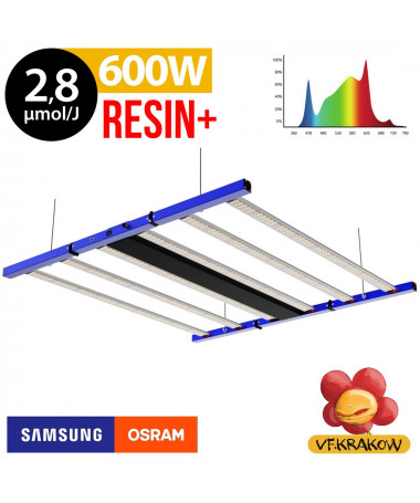 LED lampa AX 600W RESIN+ je moderní LED osvětlení s vysokou světelnou účinností 2,8 µmol/J, což ji činí skvělou volbou pro pokročilé pěstitele rostlin, zejména těch, kteří potřebují intenzivní světlo během fází růstu a květu. Zde jsou klíčové vlastnosti této lampy: